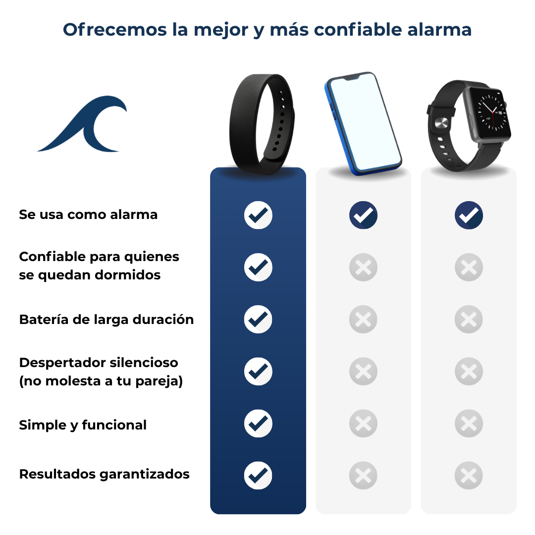 Te despierta en silencio con vibración en la muñeca —sin ruidos fuertes— ideal para parejas y familias.